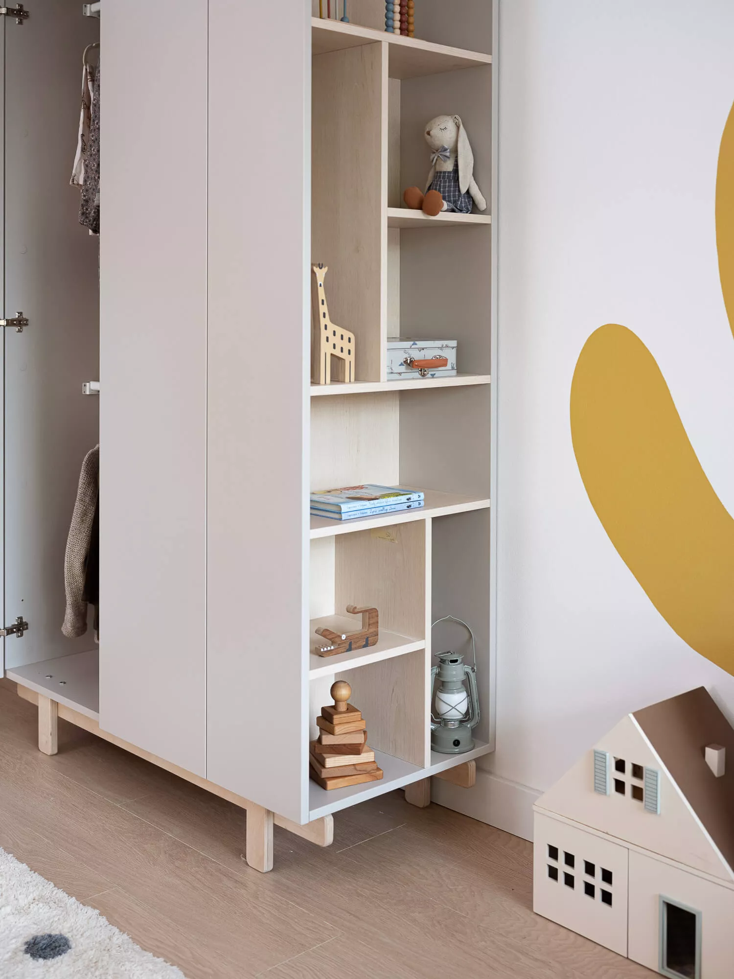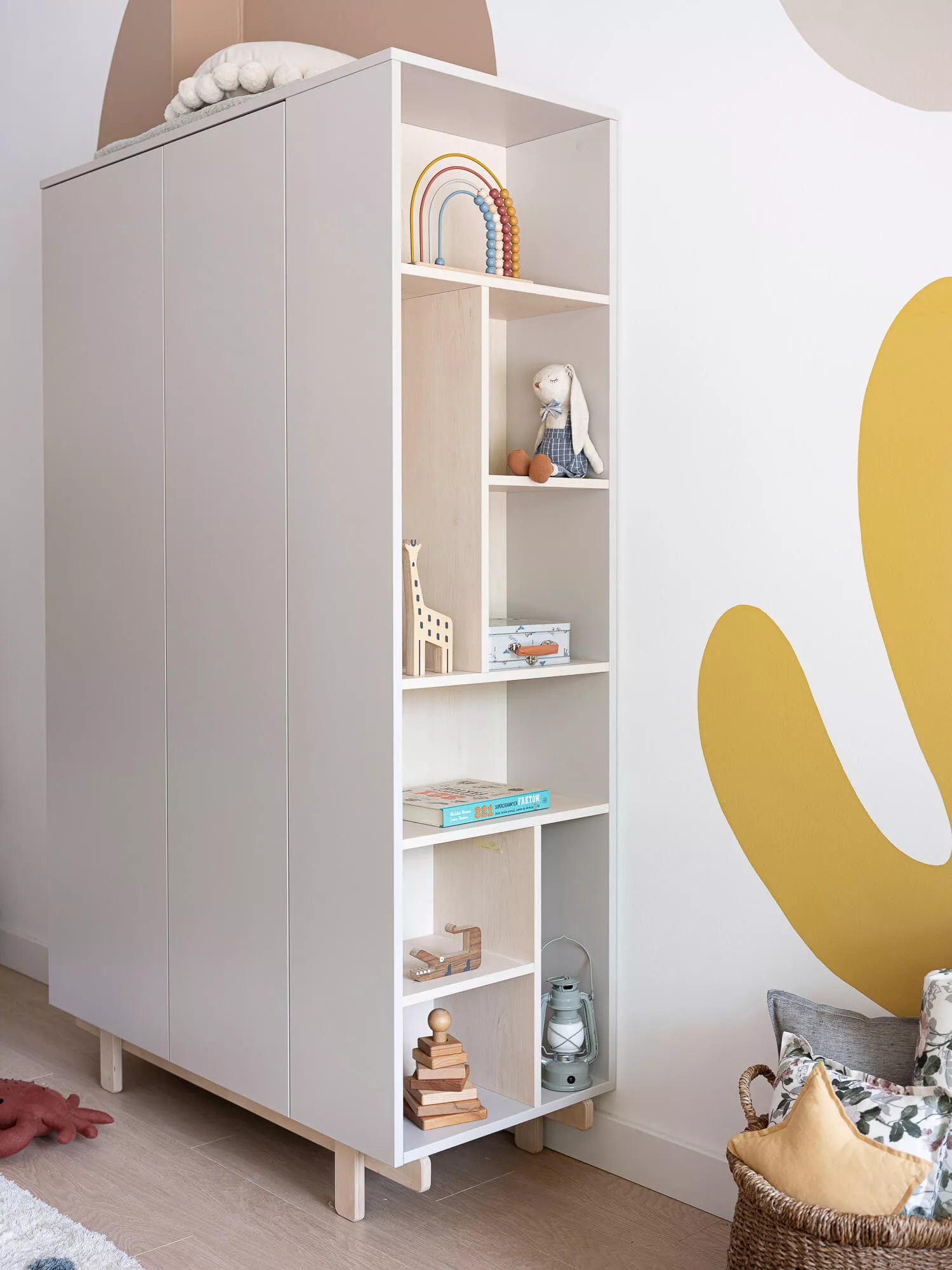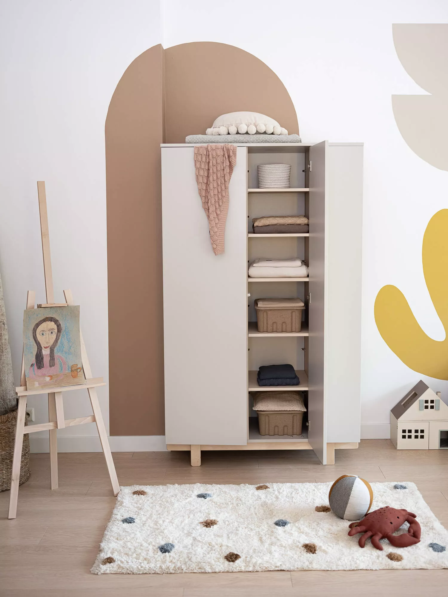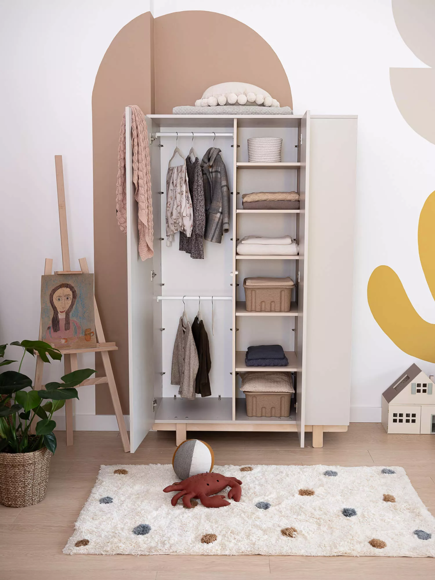 Piękna, klasyczna szafa w kolorze kaszmiru z dodatkiem naturalnego drewna. Szafa zaprojektowana jest tak aby zapewnić jak najwięcej miejsca do przechowywania. Po lewej stronie znajduje się przestrzeń przeznaczona do wieszania ubrań wyposażona w dwa drążki natomiast po prawej sześć pojemnych półek.
