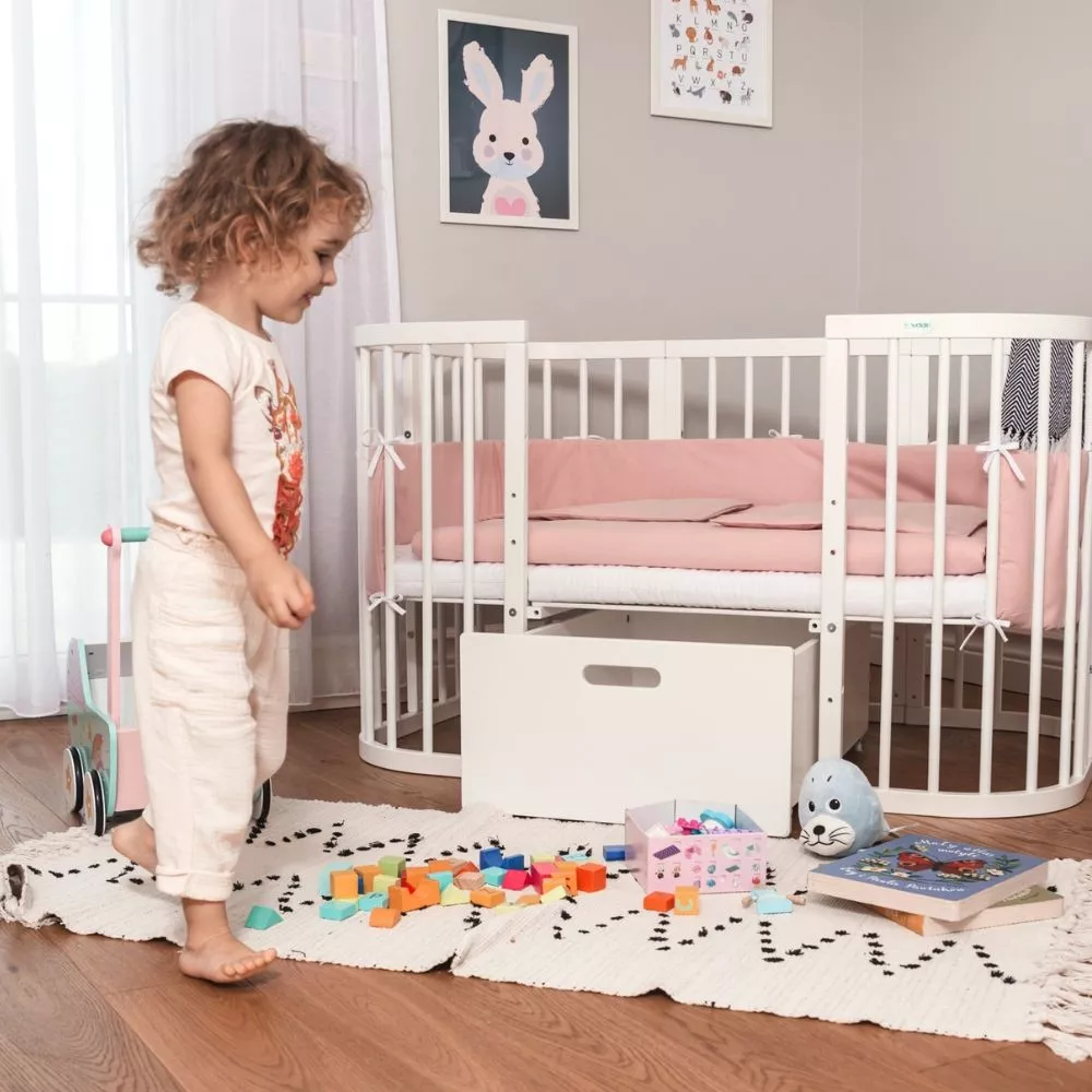 Idealnie pasuje do klasycznego oraz owalnego łóżeczka 7w1, oferując dodatkową przestrzeń do przechowywania.