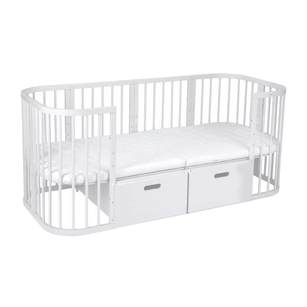 Jeśli potrzebujesz więcej miejsca do przechowywania, możesz dokupić dodatkową szufladę. Aby zainstalować dwie szuflady, wystarczy rozszerzenie do łóżeczka 7w1, które umożliwi pełne wykorzystanie przestrzeni pod łóżeczkiem.