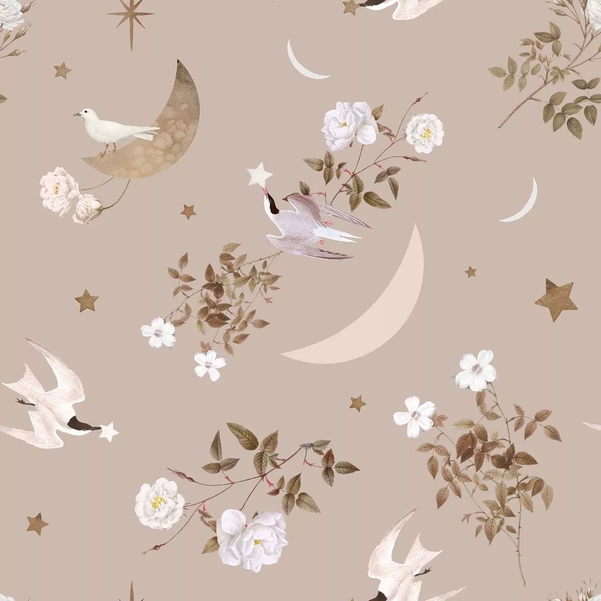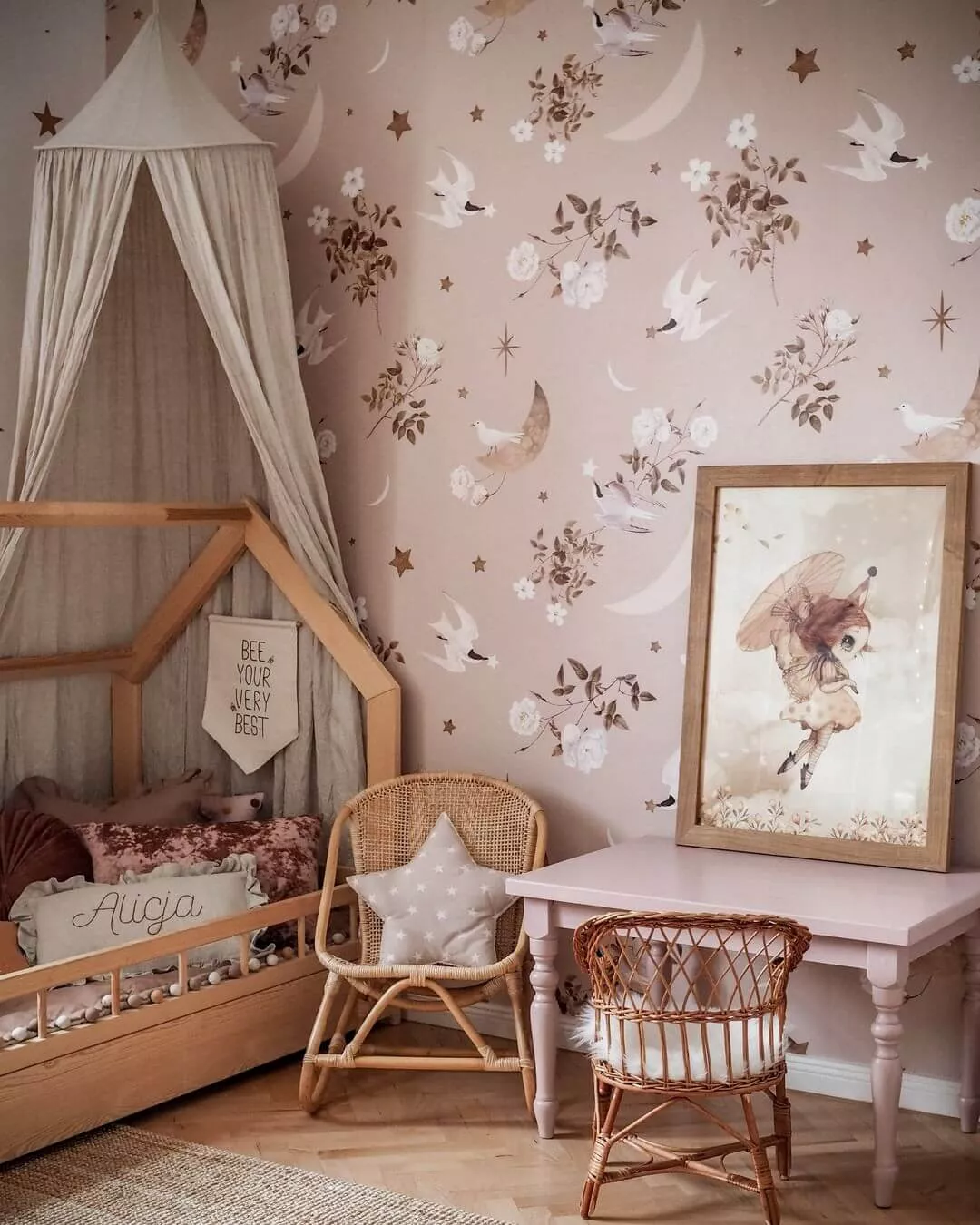 Bardzo delikatny wzór, niezbyt gęsty i w gustownych kolorach. Idealnie prezentuje się nad kołyską. Tworzy w pokoju atmosferę spokoju, snu, nieco tajemniczości, bajki. Cudowne kolory złocistego brązu, łososiowy i fiolet na beżowo-liliowym tle. Po prostu magia w pokoju maluszka. Tapeta w jaskółki to przepiękna tapeta w stylu japońskim, jeśli lubicie minimalizm to pokochacie tę tapetę. Ona dodaje surowym meblom klimatu i czaru. Mówiłyśmy, że magia!