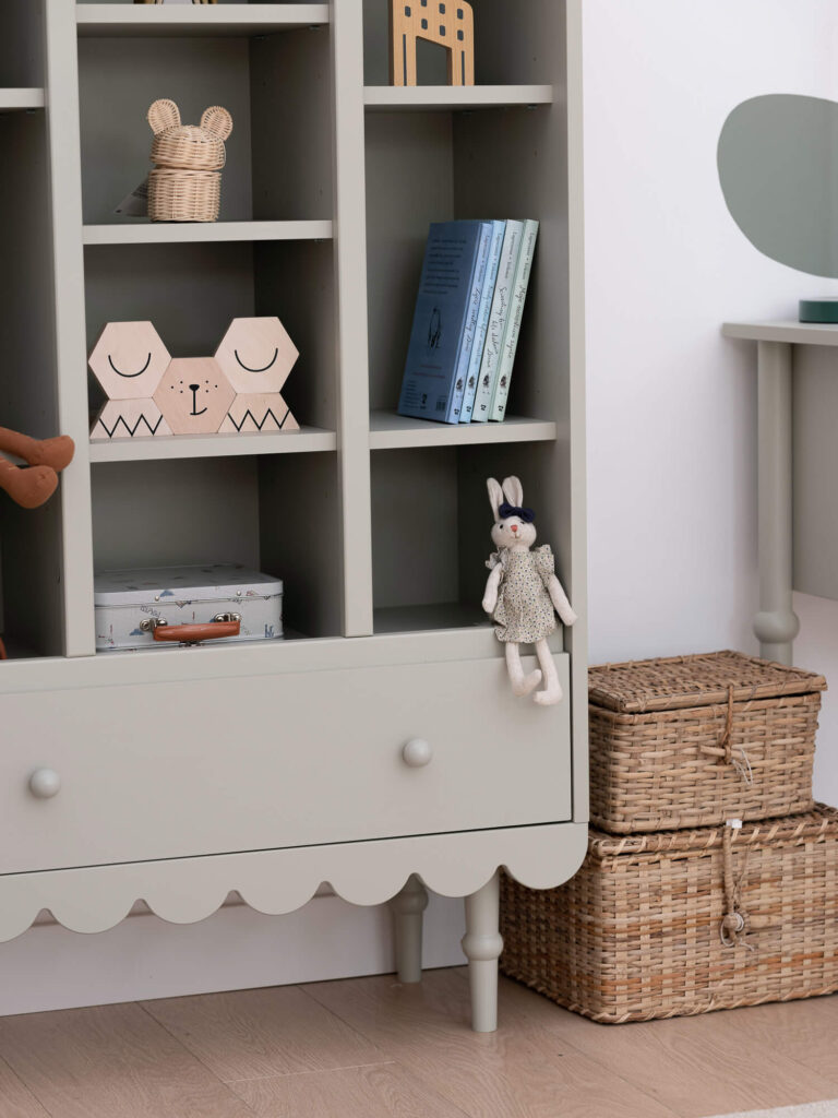 Łącząc regał Babushka z funkcjonalnymi koszami i pojemnikami, można stworzyć uporządkowaną, przyjazną dziecku przestrzeń do zabawy, nauki i przechowywania ulubionych skarbów.